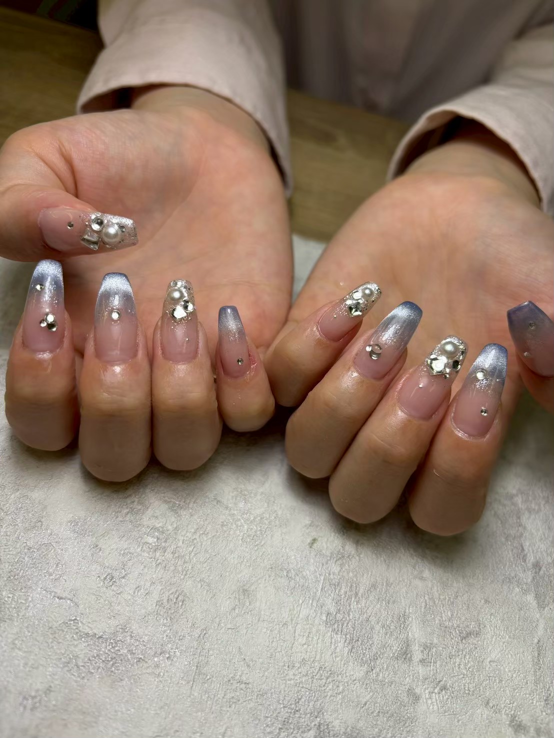 朝起きるのがちょっと辛い季節ですが、指先から気分を上げていきましょう✨こちらは、ブルーのマグネットを使用したキラキラグラデーションネイル❄️光の角度で表情が変わる、冬にぴったりのデザインです。
