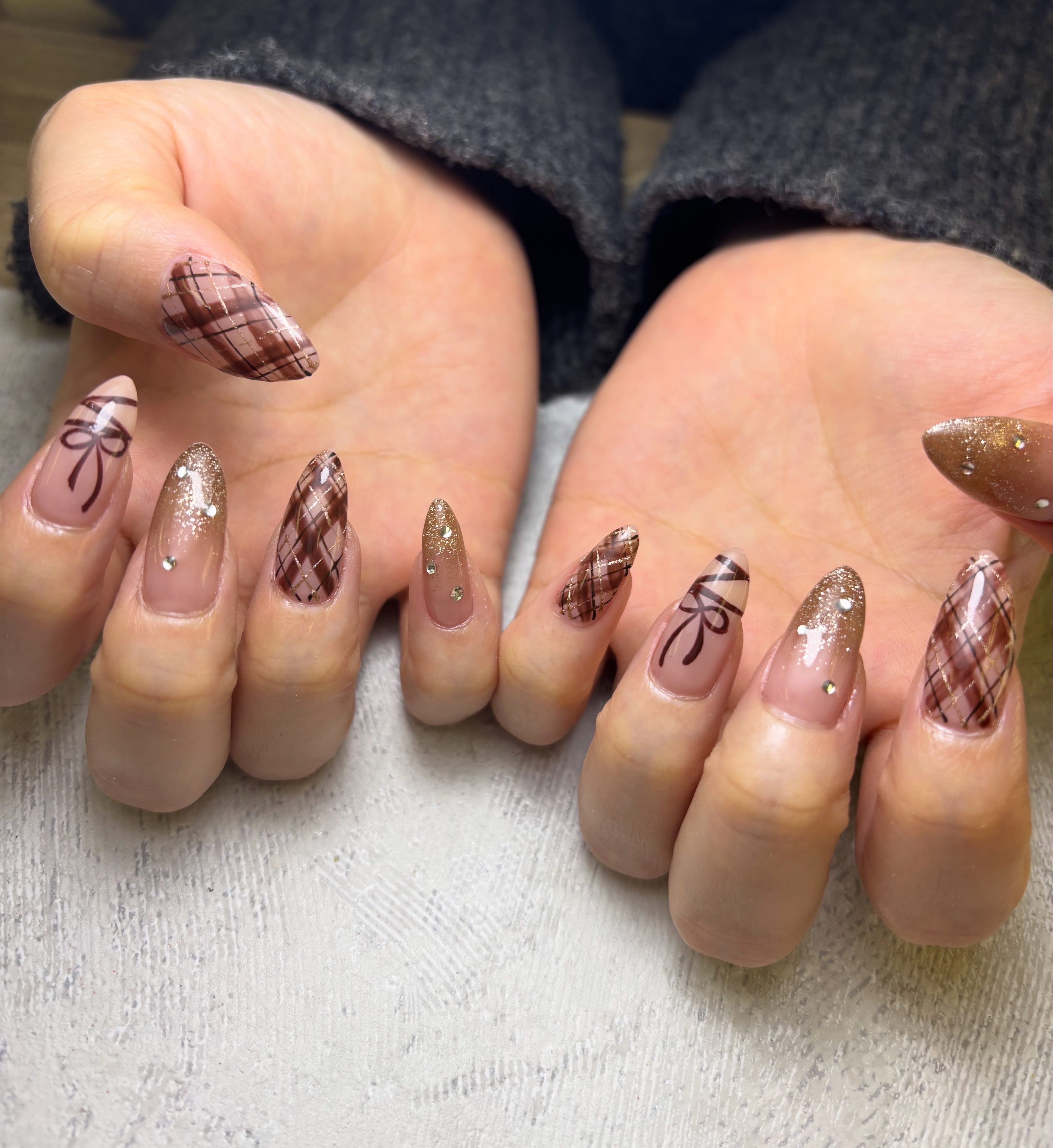 写真左は、チョコレートをイメージした甘めデザイン🍫写真右は、冬らしいニット要素にチョコレートを組み合わせた、バレンタイン感たっぷりのネイルです❄️